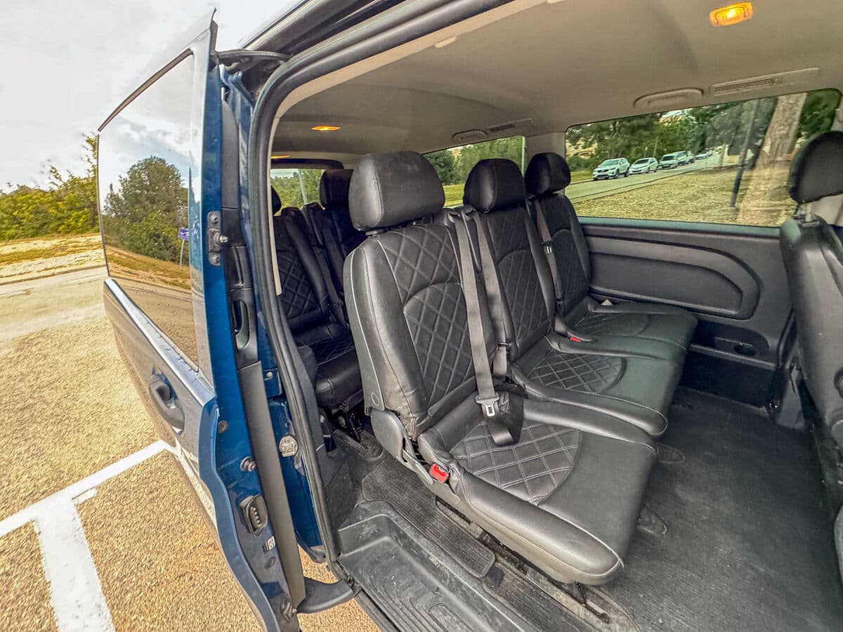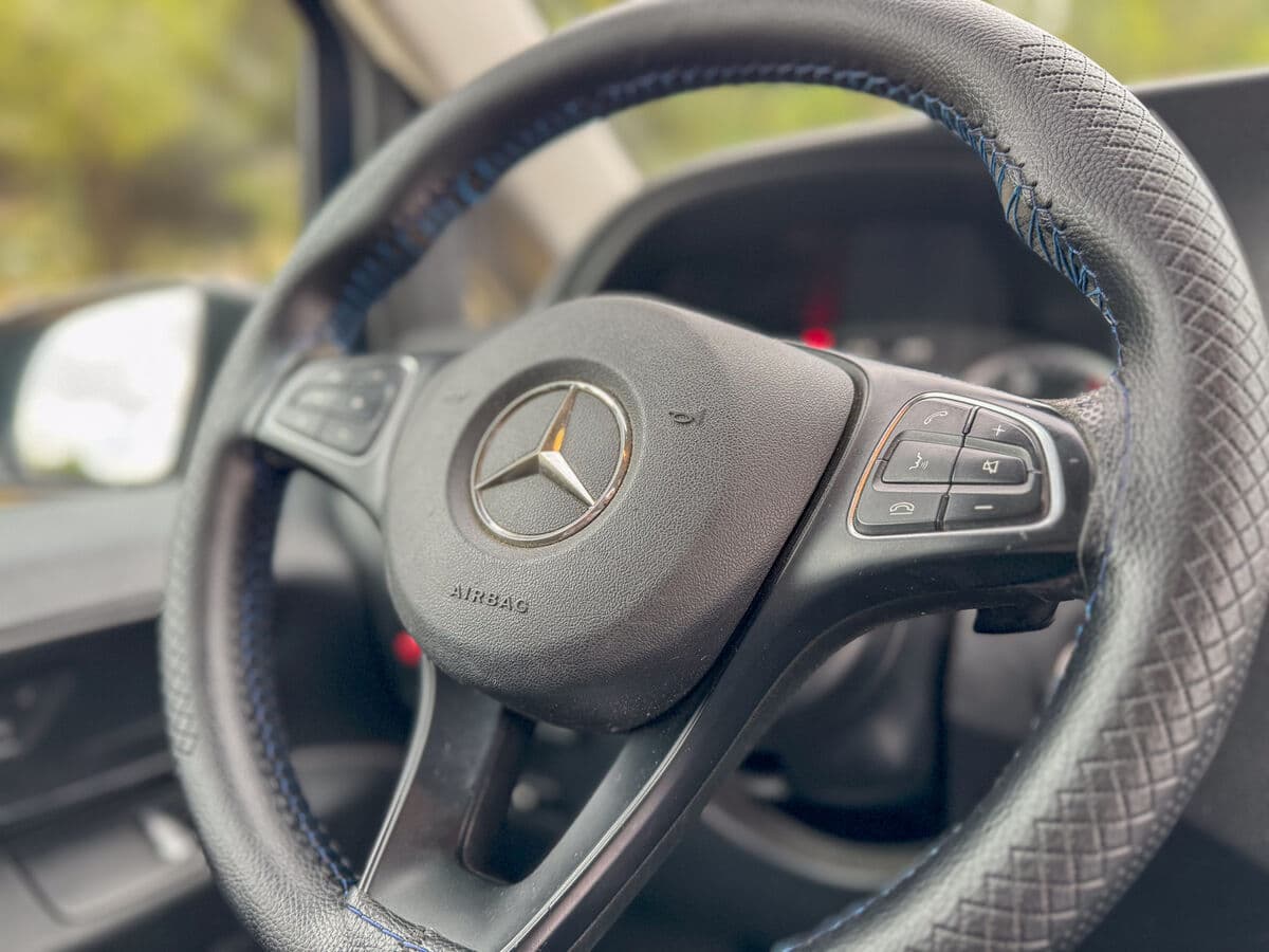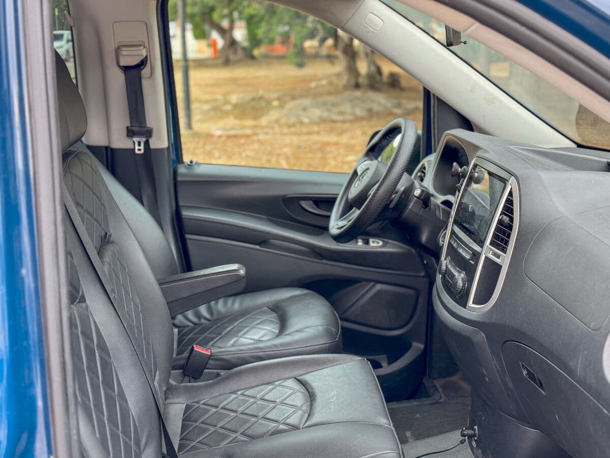 El elegante color azul marino confiere un aspecto profesional y distinguido. El interior cuenta con acabados de calidad Mercedes-Benz, climatización independiente para los pasajeros y sistemas de seguridad avanzados que protegen a todos los ocupantes.